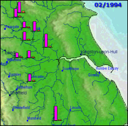 Animation of multiple point attributes. Alkalinity (pink) and lead dissolved (orange) measured at river monitoring sites and animated as monthly averages over a two year period. A peak in alkalinity tends to occur during the summer months when there is less water volume. Results of work produced by the LOIS programme, Plymouth Marine Laboratory, UK, as part of the Land-Ocean Interaction Study (LOIS) UK thematic research programme. Technical detail. The river water quality data were measured every 2 to 4 days but can be displayed within STEMgis as aggregated data over any desired period, e.g. week, month, year etc. The user may also display means, standard deviations, minima and maxima. The full data can be displayed graphically by clicking on a point. |