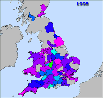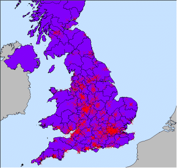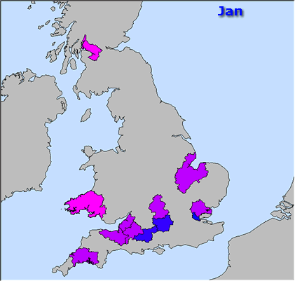 A series of images showing the analysis of hotel visitor number for a hotel in Devon, England. The top image shows the home locations of visitors to the hotel overlain on postcode boundaries. The top animation shows the results of combining these two datasets to determine the total number of vistors from each postcode region per year. This could help to determine whether there has been a hift in vistor patterns over the years and to decide whether advertising could be targeted in certain areas. Note how vistor number have been increasing in the Bristol and Birmingham areas where advertising has been carried out. The second animation shows the same data aggregated cyclically over months of the year. Each frame represents a different month. As expected visitor number increase dramatically during the summer months. |