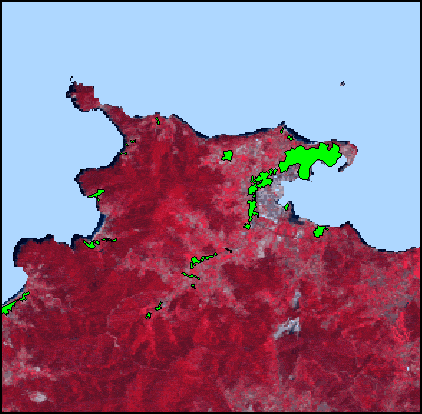 Animation of spatial data. Figure shows urban areas animated as four time slices from 1954 to 1999 overlaid on a Landsat Thematic Mapper satellite image. Data provided by Risk Management Consultants, UK, as part of the FORFAIT EU research programme. |
